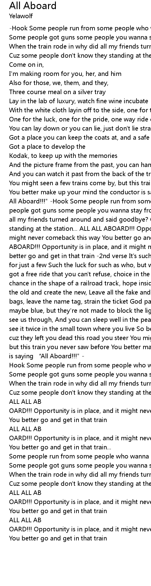 | All Aboard!!!" -Hook Some people run from some people who wanna save 'em Some people got guns some people you wanna stay from When the train rode in why did all my friends turned around and said goodbye? Cuz some people don't know they standing at the station... ALL ALL ABOARD!!! Opportunity is in place, and it might never comeback this way You better go and get in that train ALL ALL ABOARD!!! Opportunity is in place, and it might never comeback this way You better go and get in that train -2nd verse It's such a view, but it's reserved for just a few Such the luck for such as who, but who is me and who is you You got a free ride that you can't refuse, choice in the form of a new caboose A chance in the shape of a railroad track, hope inside make the move Break from the old and create the new, Leave all the fake and replace the true Pack the bags, leave the name tag, strain the ticket God payed for you Trade for blim and maybe blue, but they're not made to block the light The light from the sun will see us through, And you can sleep well in the peace of night, Cuz you might not see it twice in the small town where you live So believe in the right to life cuz they left you dead this road you steer You might seen a few trains come by, but this train you never saw before You better make up your mind the conductor is saying “All Aboard!!!" - | |