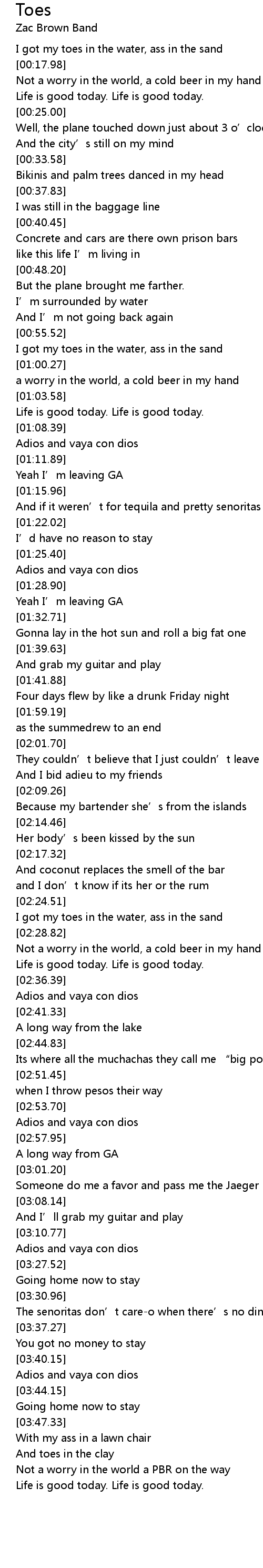 | [00:57.02] | I got my toes in the water, ass in the sand |