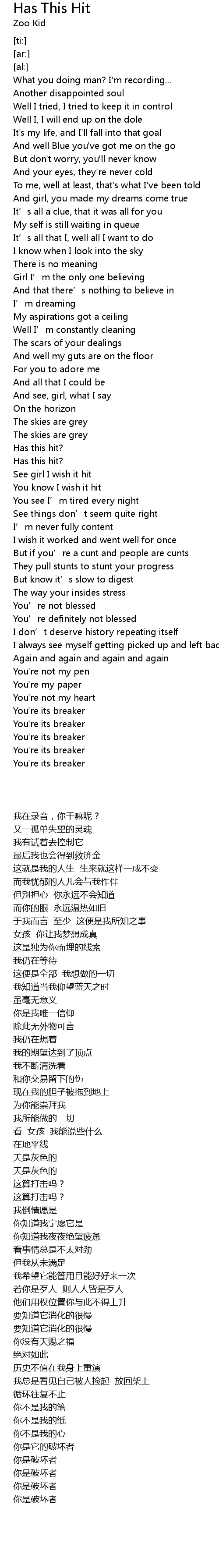 | [03:28.88] | See girl I wish it hit |