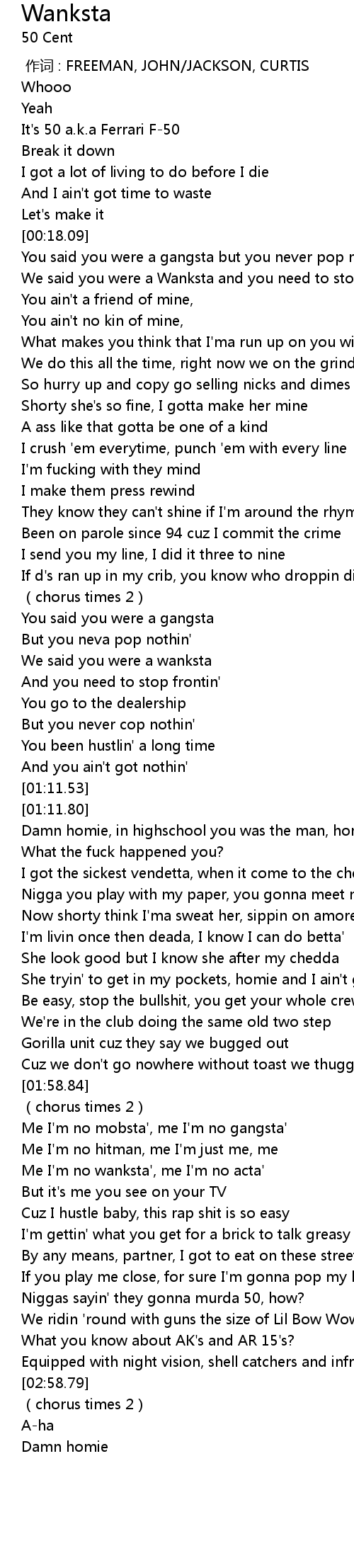 | [00:21.18] | We said you were a Wanksta and you need to stop frontin' |