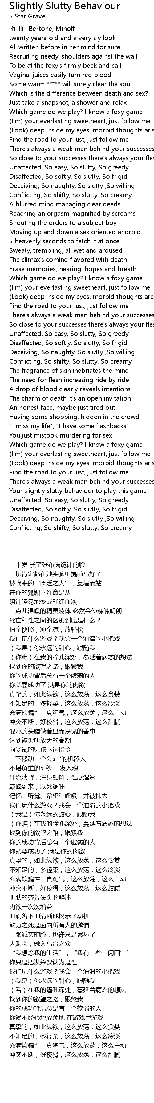 | [01:03.940] | Deceiving, So naughty, So slutty , So willing |