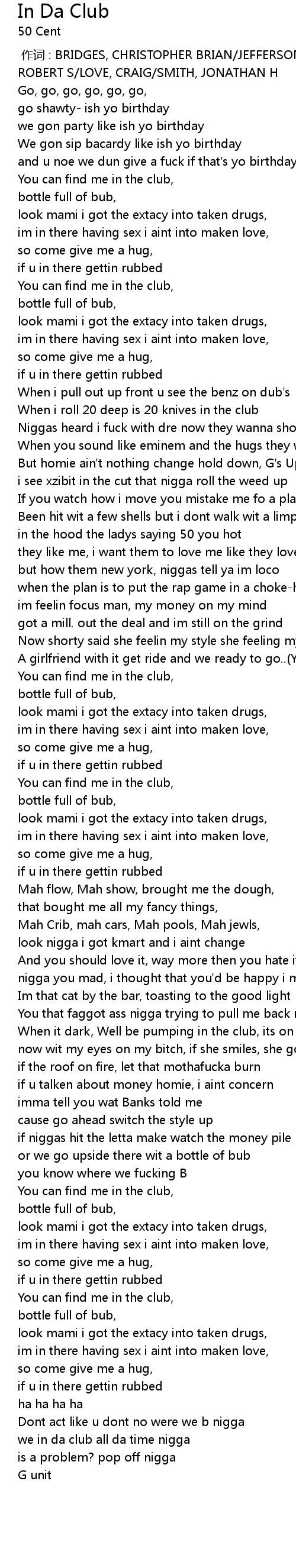 | [02:03.500] | When it dark, Well be pumping in the club, its on |