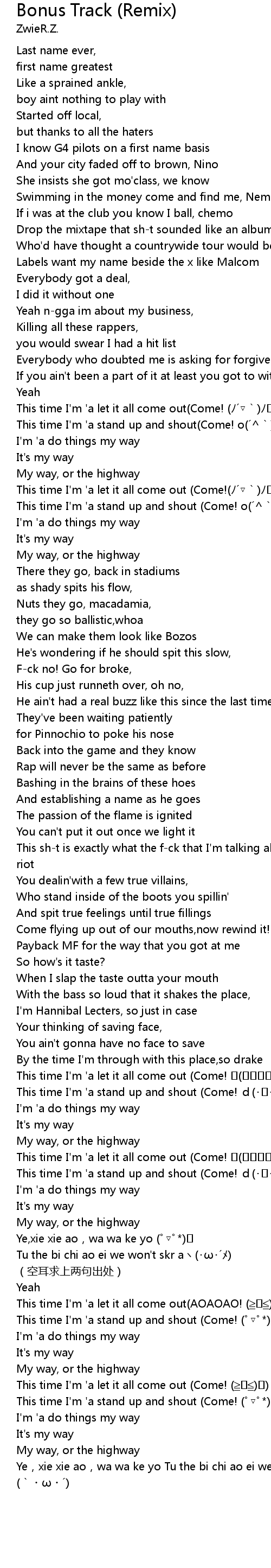 | [01:19.370] | This time I'm 'a let it all come out (Come!(ノ´▽`)ノ♪) |