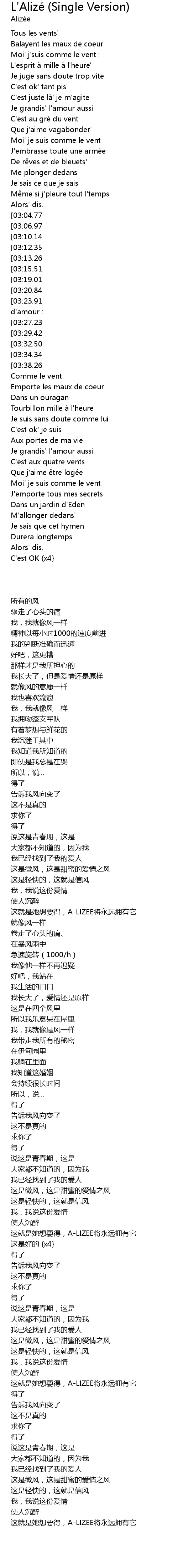 | [04:01.35][03:27.23][02:16.88][01:06.42] | C' est lé ger' c' est l' alizé' |