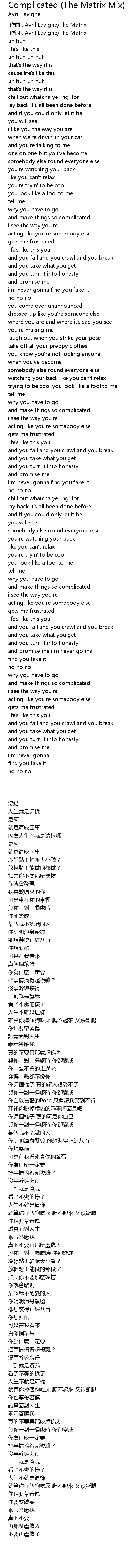 | [00:01.00] | 作词 : Avril Lavigne/The Matrix |