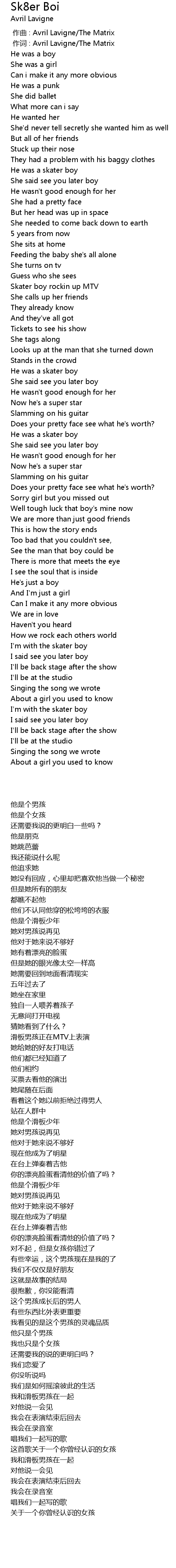 | [00:01.00] | 作词 : Avril Lavigne/The Matrix |