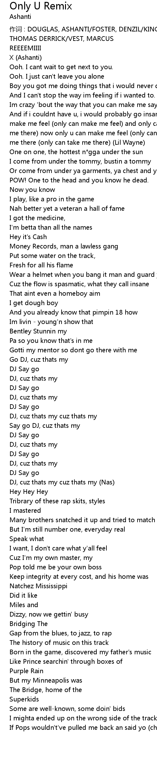 | And if i couldnt have u, i would probably go insane. Chorus now only u can make me feel only can make me feel and only can take me there only can take me there now only u can make me feel only can make me feel and only can take me there only can take me there Lil Wayne | |