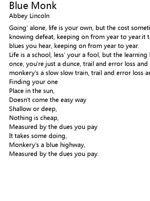 Going' alone, life is your own, but the cost sometimes is dear.being complete, knowing defeat, keeping on from year to year.it takes some doing, monkery's the blues you hear, keeping on from year to year. |
