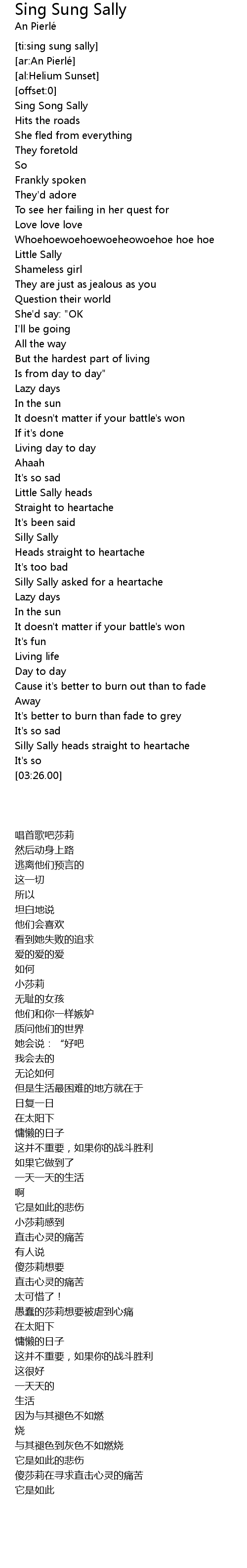 | [02:58.62] | Silly Sally heads straight to heartache |
