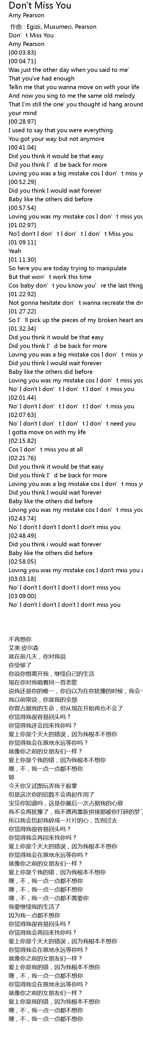 | [01:56.88] | No' I don't I don’t I don’t I don’t miss you |
