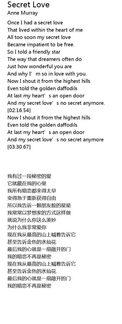 | [01:56.54] | And my secret love' s no secret anymore. |