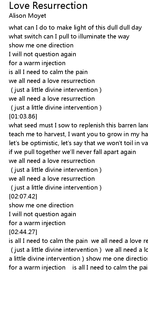 | [02:44.86] | is all I need to calm the pain we all need a love resurrection (just a little divine intervention) we all need a love resurrection (just a little divine intervention)show me one direction I will not question again for a warm injection is all I need to calm the pain |