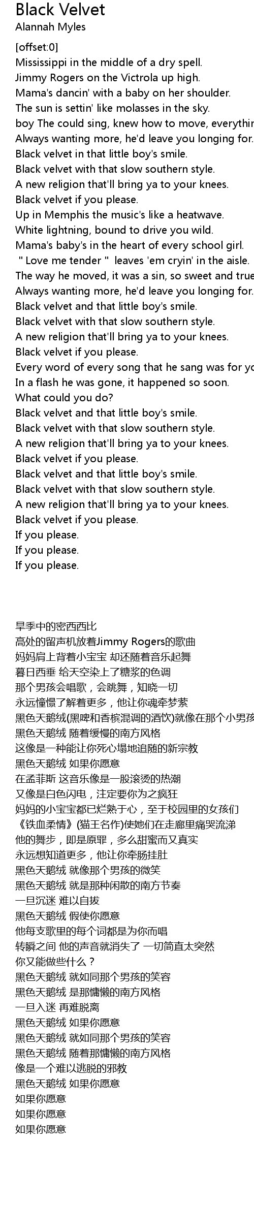 | [03:22.92] | Black velvet and that little boy' s smile. |