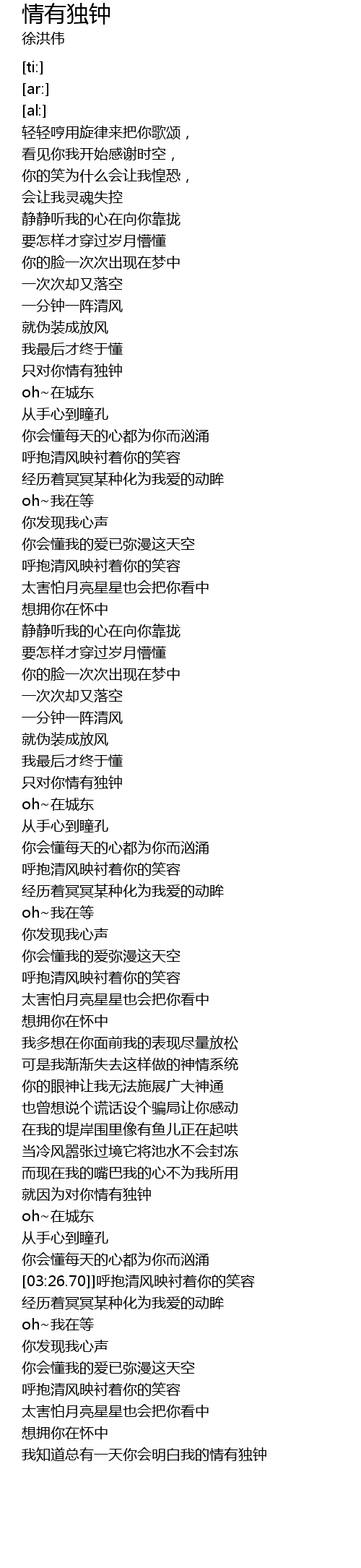 | [02:04.90] | zhǐ duì nǐ qíng yǒu dú zhōng |