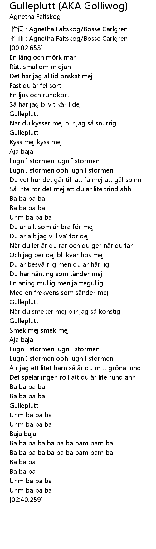 | [00:01.000] | 作曲 : Agnetha Faltskog/Bosse Carlgren |