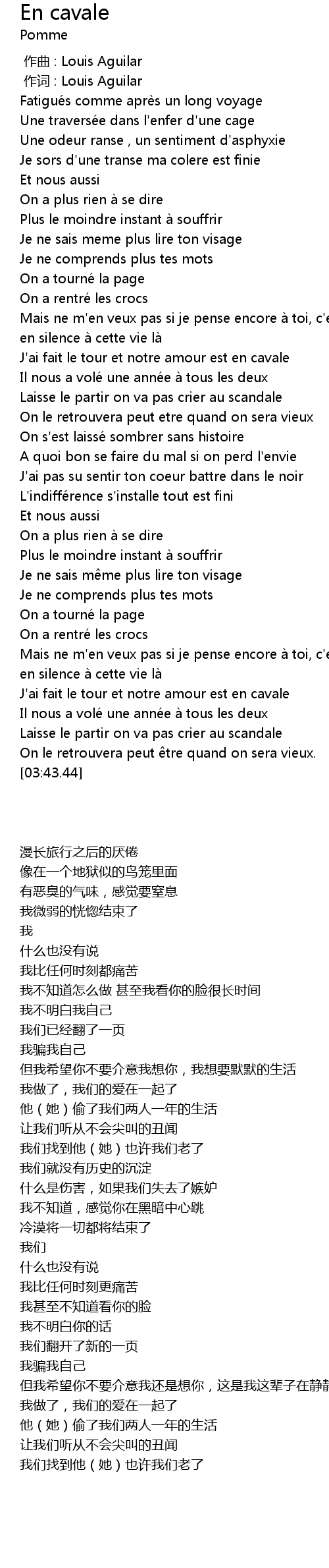 | [03:05.64] | J'ai fait le tour et notre amour est en cavale |