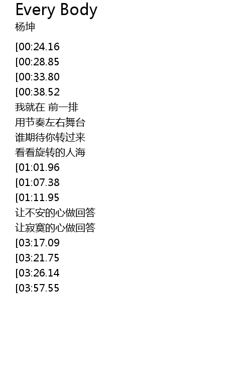 | [03:38.62][03:17.09][02:38.52][01:21.88] | Every Body oh ài jiù shì nǐ |