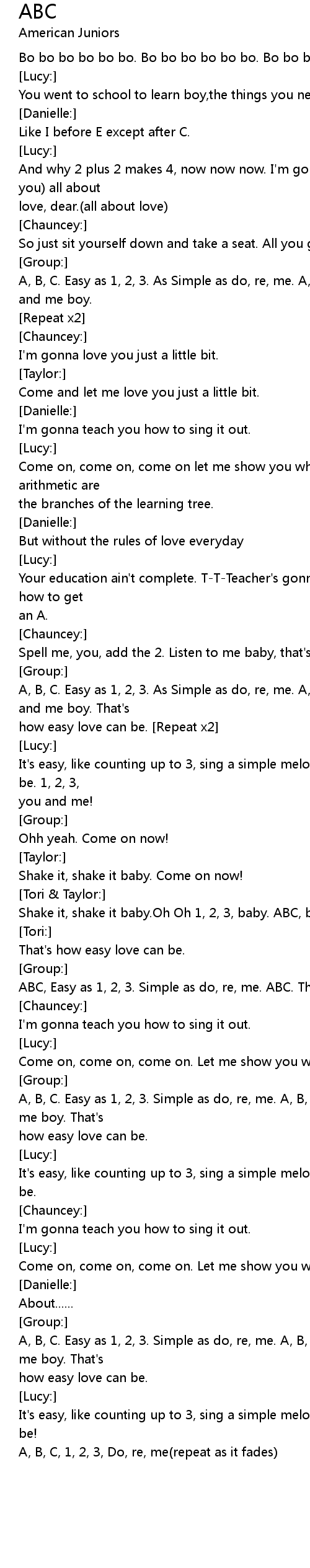 A, B, C. Easy as 1, 2, 3. Simple as do, re, me. A, B, C, 1, 2, 3, baby you and me boy. That's |