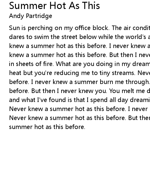 Sun is perching on my office block. The air conditioning's run away. No one dares to swim the street below while the world's a ball of baking clay. Never knew a summer hot as this before. I never knew a summer burn me through. Never knew a summer hot as this before. But then I never knew you. Bed is drowning me in sheets of fire. What are you doing in my dreams? I'm usually immune to August heat but you're reducing me to tiny streams. Never knew a summer hot as this before. I never knew a summer burn me through. Never knew a summer hot as this before. But then I never knew you. You melt me down enough to fill a coffee cup and what I've found is that I spend all day dreaming that you'll drink me up. Never knew a summer hot as this before. I never knew a summer burn me through. Never knew a summer hot as this before. But then I never knew you. Never knew a summer hot as this before.