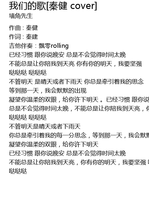 | yǐ jīng xí guàn gēn nǐ shuō wǎn ān zǒng shì bú huì jué de shí jiān tài wǎn bù néng zǒng shì ràng nǐ péi wǒ dào tiān liàng, nǐ yǒu nǐ de míng tiān, wǒ yào jiān qiáng dā dā dā dā dā dā |