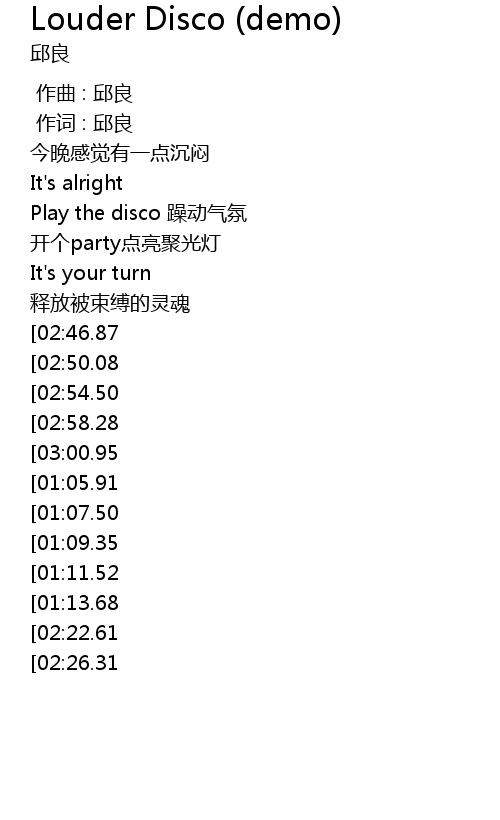 | [03:02.57][02:46.87][01:35.71][00:48.51] | Disco disco不会停下来 |