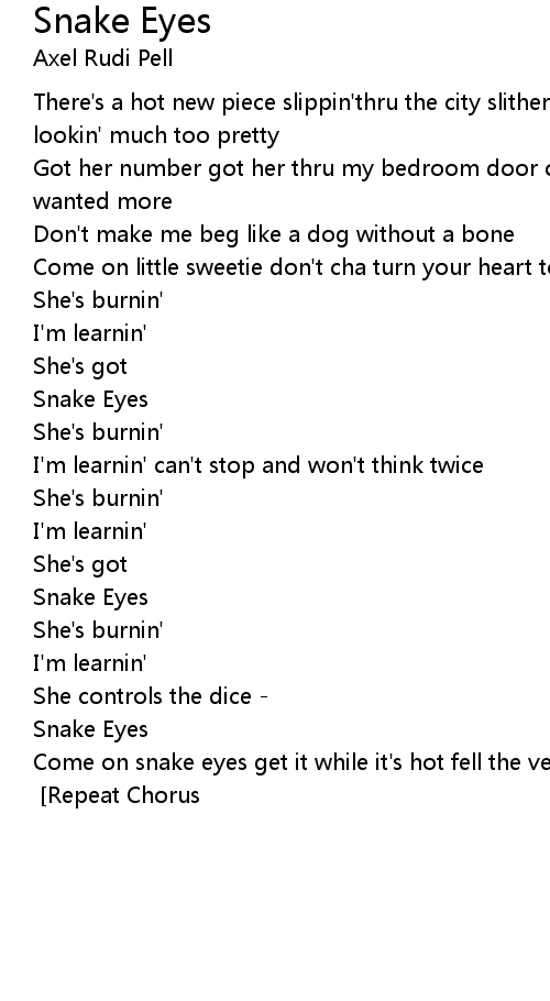 Come on snake eyes get it while it's hot fell the venom sting ya get every last drop [Repeat Bridge] [Repeat Chorus] [Solo] [Repeat Chorus] |