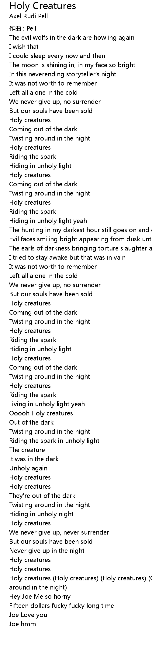 | Holy creatures Holy creatures Holy creatures Out of the dark Twisting around in the night | |