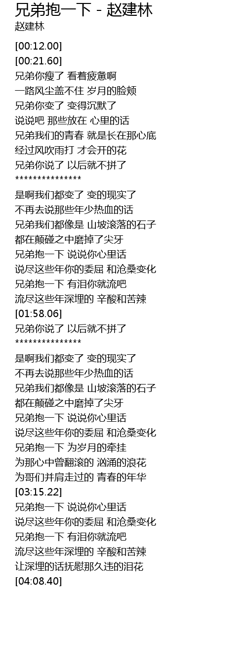 | [03:38.14] | 兄弟抱一下 说说你心里话 |