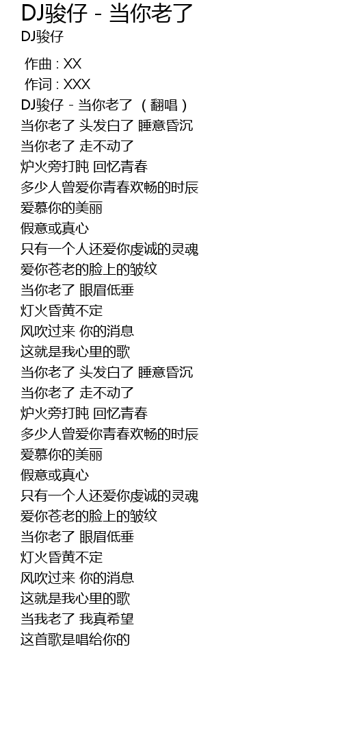 | [00:04.80] | DJ骏仔 - 当你老了 (翻唱) |