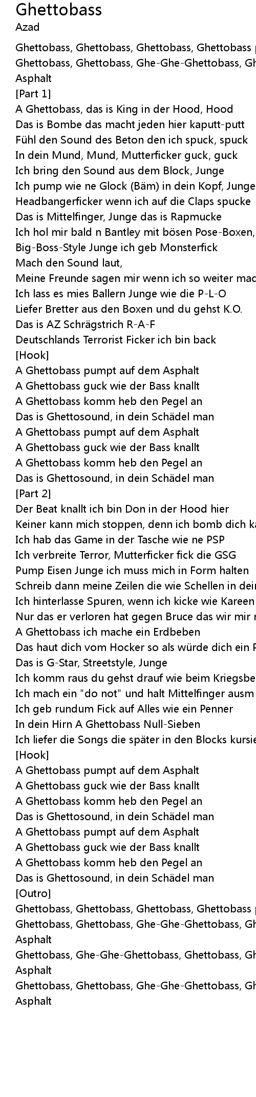 | Ghettobass, Ghettobass, Ghe-Ghe-Ghettobass, Ghettobass pu-pu-pumpt auf dem Asphalt | |