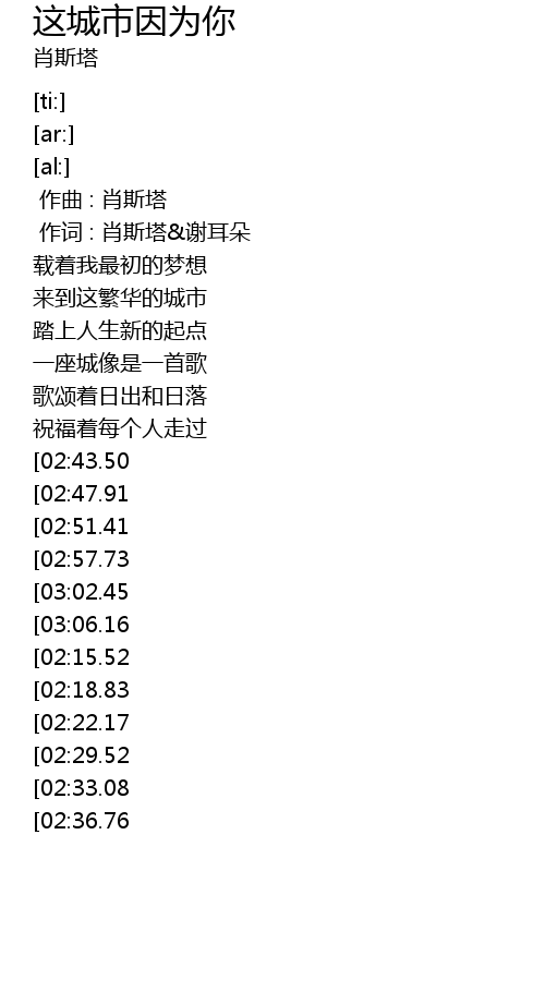 | [03:26.56][02:43.50][02:43.30][01:16.00] | 这城市因为你有了我 |