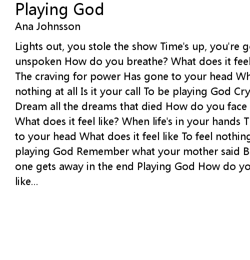 Lights out, you stole the show Time's up, you're good to go The truth won't be unspoken How do you breathe? What does it feel like? When life's in your hands The craving for power Has gone to your head What does it feel like To feel nothing at all Is it your call To be playing God Cry all the tears they've cried Dream all the dreams that died How do you face his father? How do you breathe? What does it feel like? When life's in your hands The craving for power Has gone to your head What does it feel like To feel nothing at all Is it your call To be playing God Remember what your mother said Boy, you better make amends Cos no one gets away in the end Playing God How do you breathe? What does it feel like... |