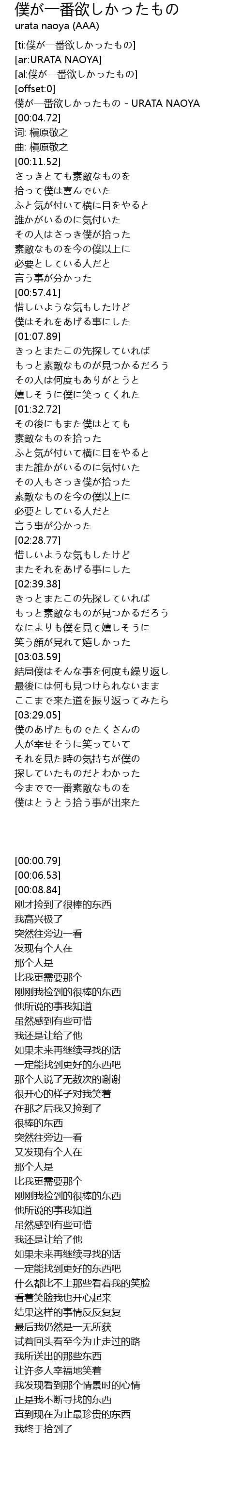 | [00:00.79] | 僕が一番欲しかったもの - URATA NAOYA |