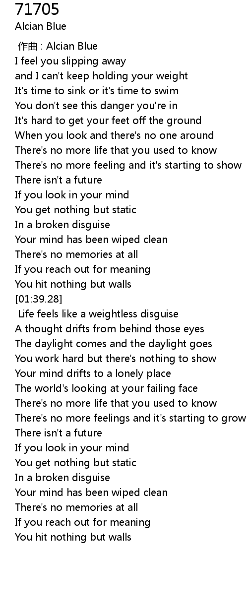 | [01:04.76] | There's no more feeling and it's starting to show |