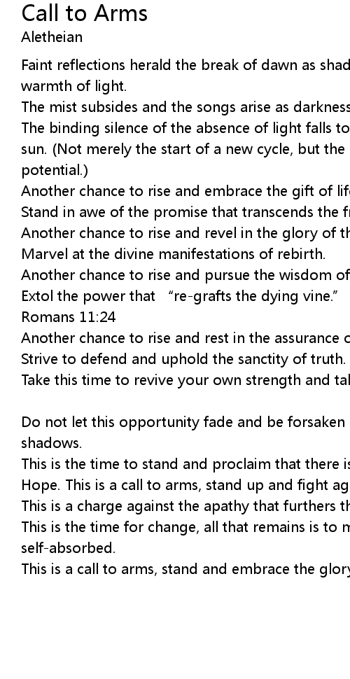 | This is a call to arms, stand and embrace the glory that this day unfolds. |