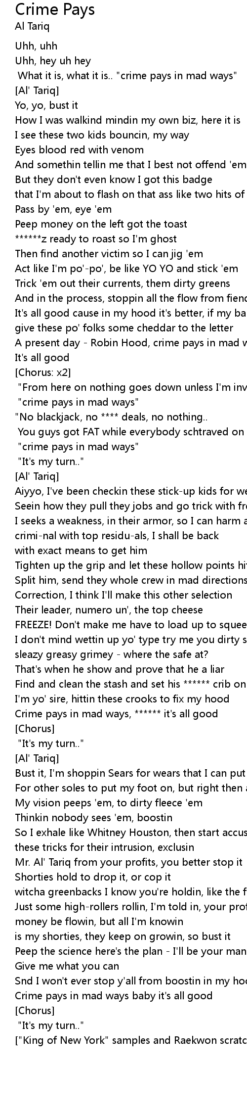 [Raekwon:] What it is, what it is.. "crime pays in mad ways"