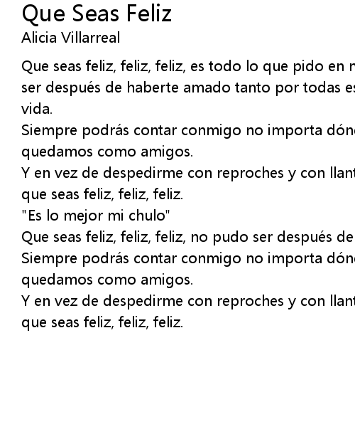 | Que seas feliz, feliz, feliz, es todo lo que pido en nuestra despedida no pudo ser despue s de haberte amado tanto por todas esas cosas tan absurdas de la vida. | |