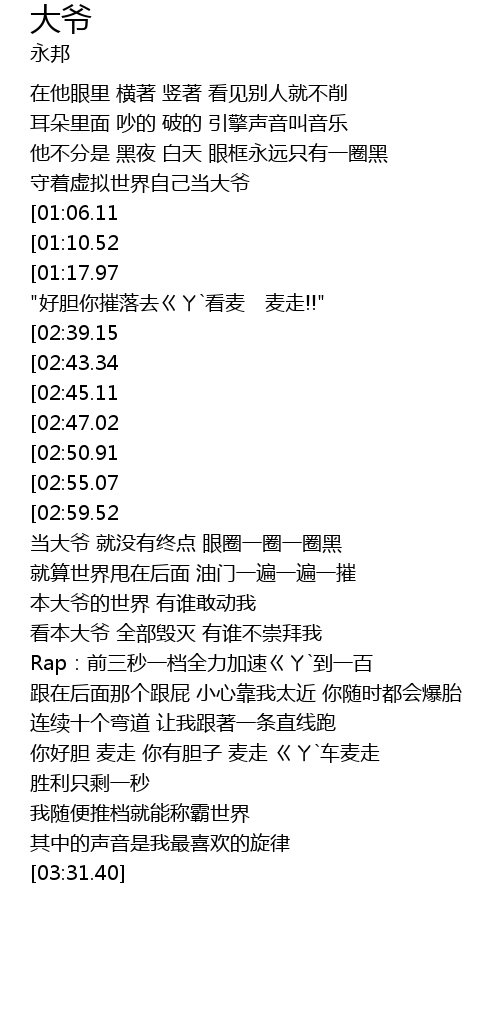 | [03:02.82][02:39.15][01:24.39] | 谁当大爷谁要闪一边 |