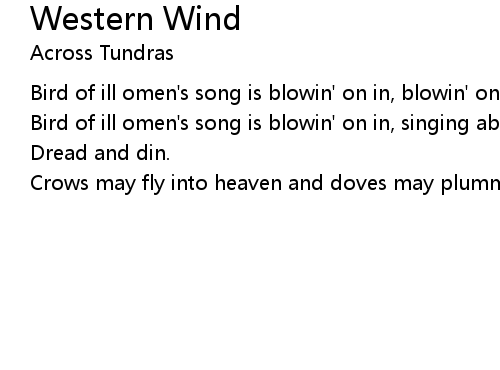 | Bird of ill omen's song is blowin' on in, blowin' on in, in the western wind. | |
