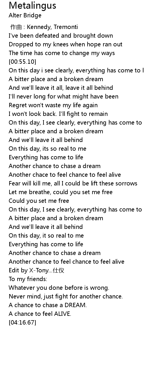 | [04:08.64] | A chance to feel ALIVE. |