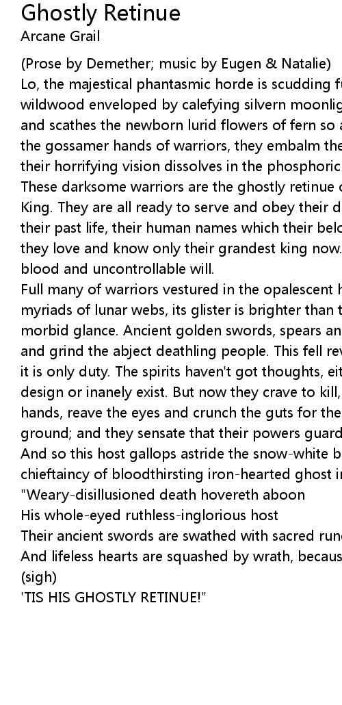 And so this host gallops astride the snow-white bewitched wolves under the chieftaincy of bloodthirsting iron-hearted ghost in the impenetrable night. |
