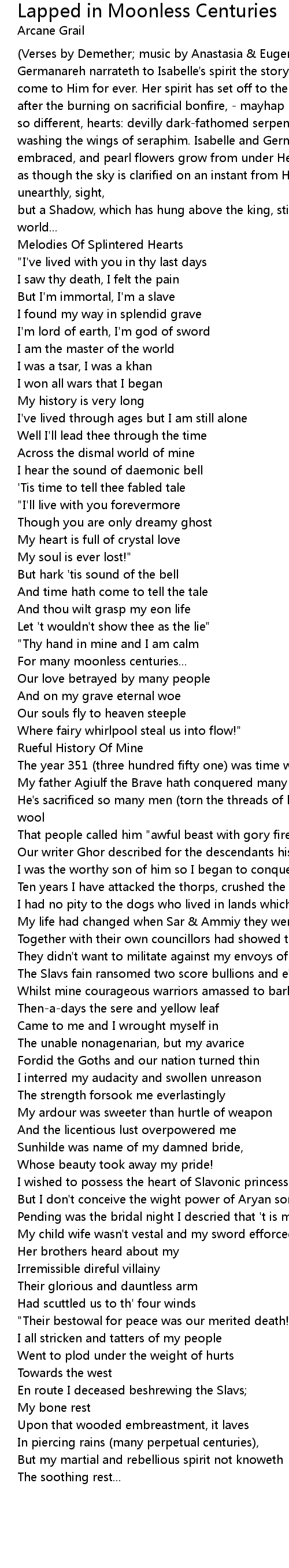 | Germanareh narrateth to Isabelle's spirit the story of His life, when She has come to Him for ever. Her spirit has set off to the world of her favourite king after the burning on sacrificial bonfire, - mayhap Love has connected these two, so different, hearts: devilly dark-fathomed serpent and light morning windflaw, washing the wings of seraphim. Isabelle and Germanareh stride in a wood having embraced, and pearl flowers grow from under Her steps, | |