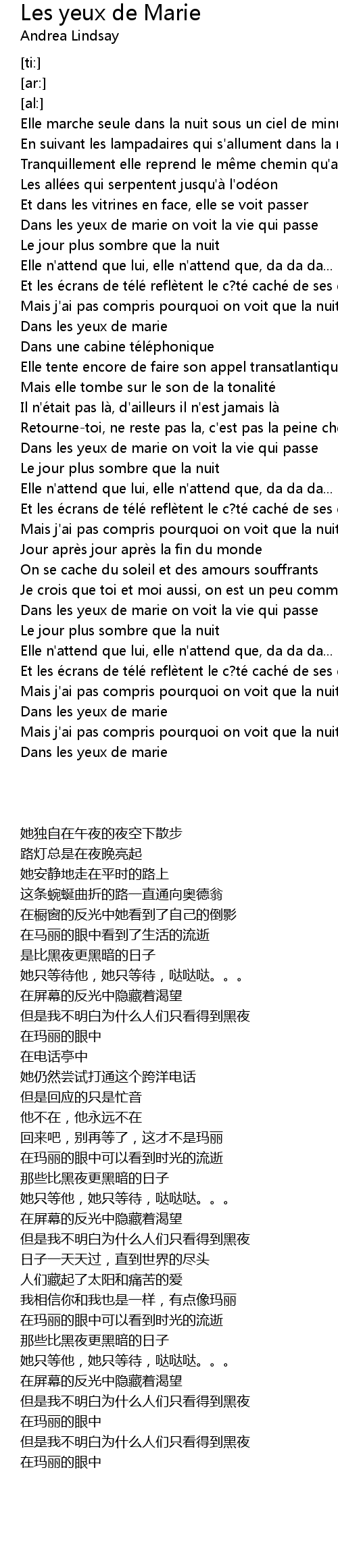 | [00:33.60] | Dans les yeux de marie on voit la vie qui passe |