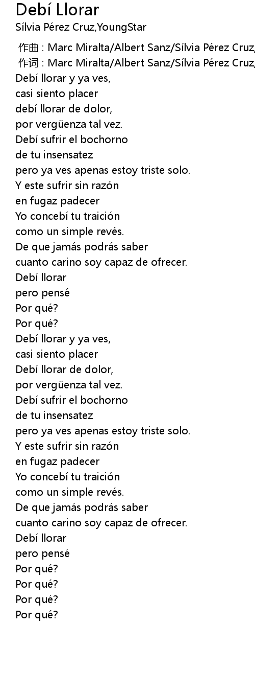| [00:01.00] | zuò cí : Marc Miralta Albert Sanz Sí lvia Pé rez Cruz Javier Colina |