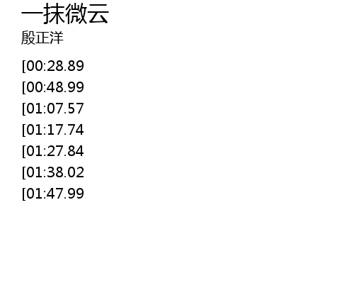 | [02:13.59][00:28.89] | 一抹微云稍过山颠 几片红叶飘落窗前 |