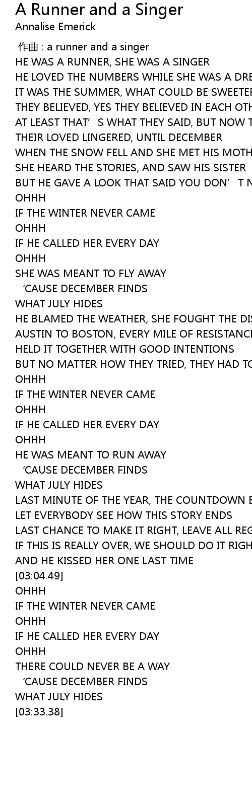 | [00:12.61] | HE WAS A RUNNER, SHE WAS A SINGER |