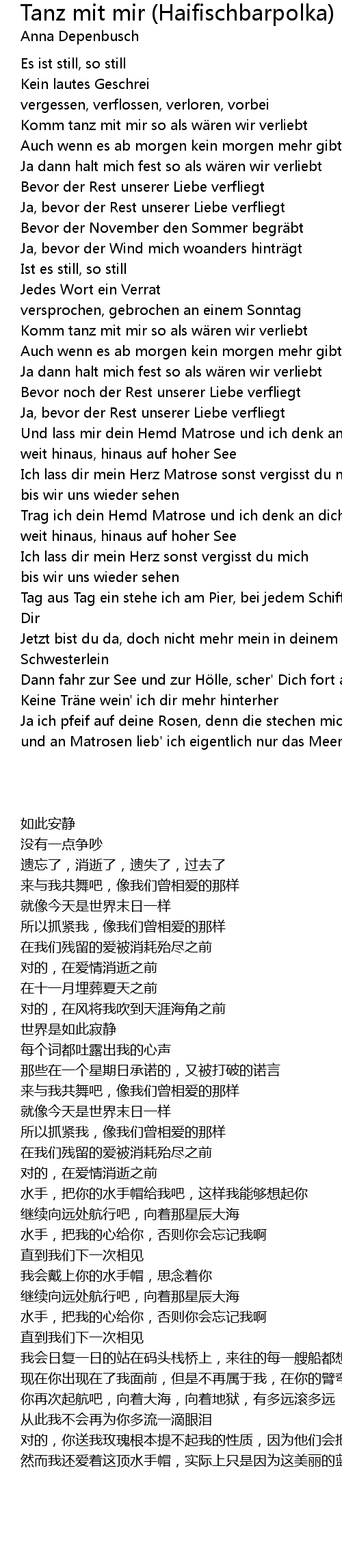 | [03:23.23] | Ich lass dir mein Herz Matrose sonst vergisst du mich |