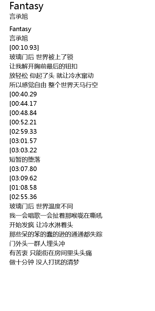 | [03:17.91][03:01.57][02:45.50][02:12.78][01:56.75][00:58.73] | 疯狂的 Fantasy |