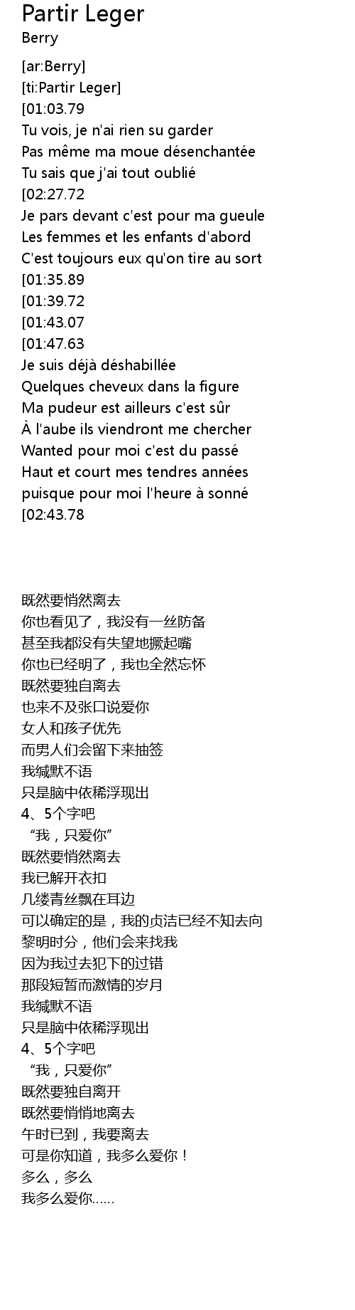 | [00:15.69][01:03.79][02:23.82] | Puisqu' il faudra partir lé ger |