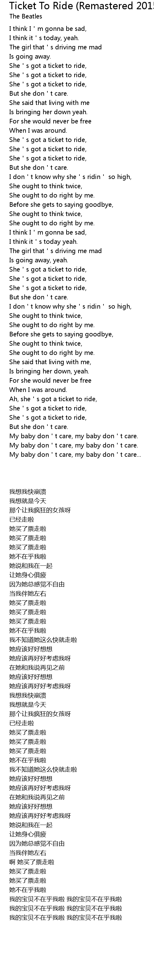 | [02:31.00] | Ah, she s got a ticket to ride, |
